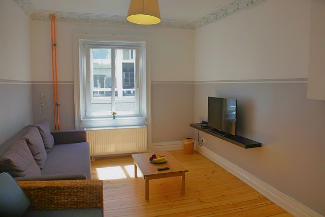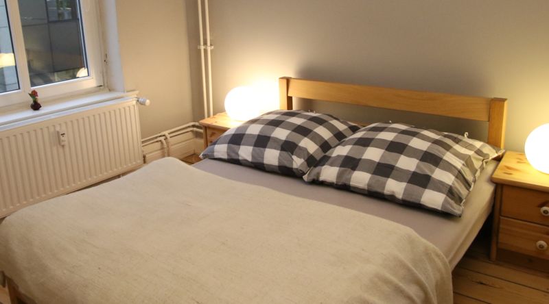 DAS APARTMENT im 2. Stock ist ca. 40 Quadratmeter groß und hat ein Schlafzimmer mit einem bequemen Doppelbett, 160 x 200 cm. Im großen Wohn- und Esszimmer ist ein bequemes Schlafsofa, auf dem zwei weitere Personen schlafen können. So finden maximal vier Personen Platz - aber beachte: Das Wohnzimmer ist ein Durchgangszimmer zum Schlafzimmer, die Privatsphäre ist also in Gruppen eingeschränkt. Die Wohnung ist so auch besonders gut für zwei Personen geeignet, die zusammen reisen aber nicht in einem Bett schlafen möchten. Im Küchenbereich des Apartments ist ein Frühstücks- und Esstisch, an dem bis zu vier Personen Platz finden.