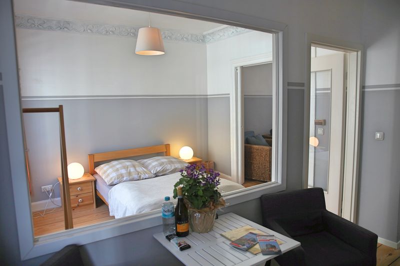 DAS APARTMENT im 3. Stock ist ca. 40 Quadratmeter groß und hat ein Schlafzimmer mit einem bequemen Doppelbett, 140 x 200 cm. Im großen Wohn- und Esszimmer ist ein bequemes Schlafsofa, auf dem zwei weitere Personen schlafen können. So finden maximal vier Personen Platz, beide Räume haben einen separaten Zugang zum Flur und Badezimmer. Die Wohnung ist so auch besonders gut für zwei Personen geeignet, die zusammen reisen aber nicht in einem Bett schlafen möchten. Im Küchenbereich des Apartments ist ein Frühstücks- und Esstisch, an dem bis zu vier Personen Platz finden.