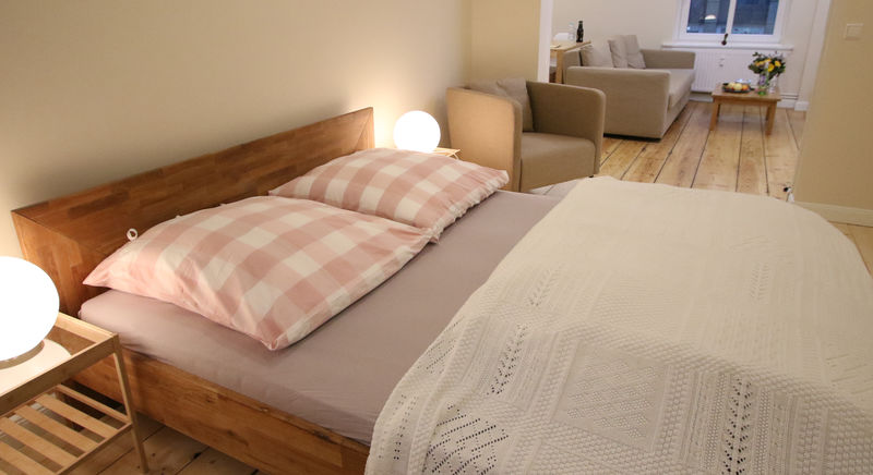 DAS APARTMENT im 1. Stock ist ca. 40 Quadratmeter groß und hat ein Schlafzimmer mit einem bequemen Doppelbett, 160 x 200 cm. Im großen Wohn- und Esszimmer ist ein bequemes Schlafsofa, auf dem zwei weitere Personen schlafen können. So finden maximal vier Personen Platz - aber beachte: Das Wohnzimmer ist ein Durchgangszimmer zum Schlafzimmer, die Privatsphäre ist also in Gruppen eingeschränkt. Die Wohnung ist so auch besonders gut für zwei Personen geeignet, die zusammen reisen aber nicht in einem Bett schlafen möchten. Im Küchenbereich des Apartments ist ein Frühstücks- und Esstisch, an dem bis zu vier Personen Platz finden.